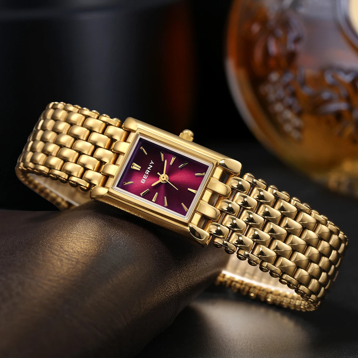 Burgundy Red Luxury Women's Quartz Square Watch with Stainless Steel Band